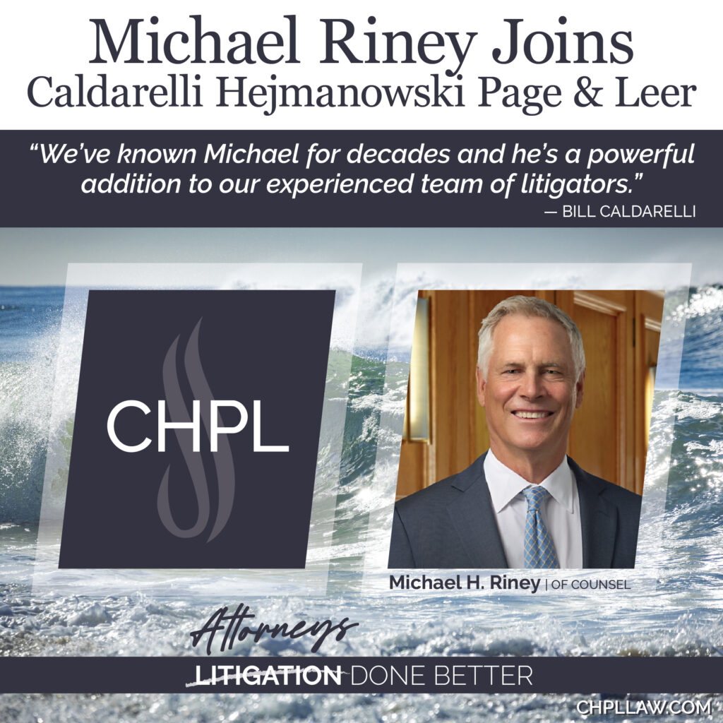Michael Riney joins CHPL as “of counsel” following 25 years at the helm of Vantage Law Group, a litigation boutique focused on the representation of business persons in complex disputes including antitrust, unfair business practice, fiduciary and business fraud claims. Prior to launching Vantage Law Group, Michael was a shareholder and member of the Executive Committee of Seltzer Caplan McMahon Vitek.