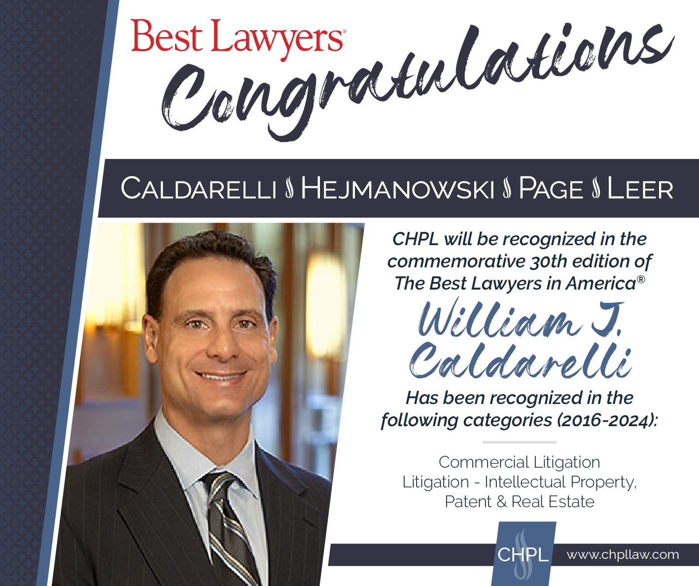 William J. Caldarelli, first listed in 2016, has been recognized in the following categories: Commercial Litigation, and Litigation – Intellectual Property, Patent, and Real Estate. See image here