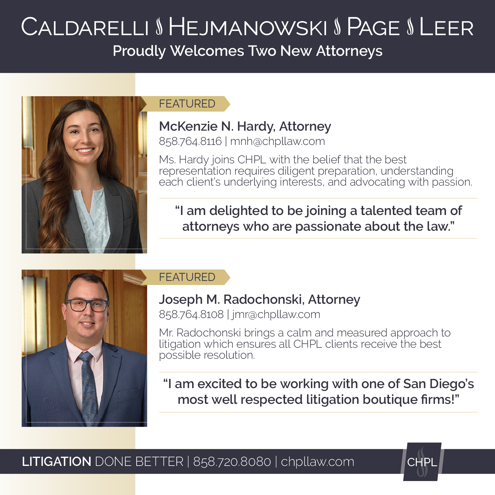 2025 San Diego “Super Lawyers” has recognized ALL SIX CHPL Partners. Bill Caldarelli was additionally recognized on the Super Lawyers “Top 50” List in San Diego in the Business Litigation practice area. Lee Hejmanowski, Jack Leer, Ben West, and David Lichtenstein were named “Super Lawyers” in the Business Litigation practice area. Marisa Janine-Page was named a “Super Lawyer” in the Appellate practice area. McKenzie N. Hardy was named a Super Lawyers “Rising Star,” in the Business Litigation practice area. Congratulations CHPL!!!